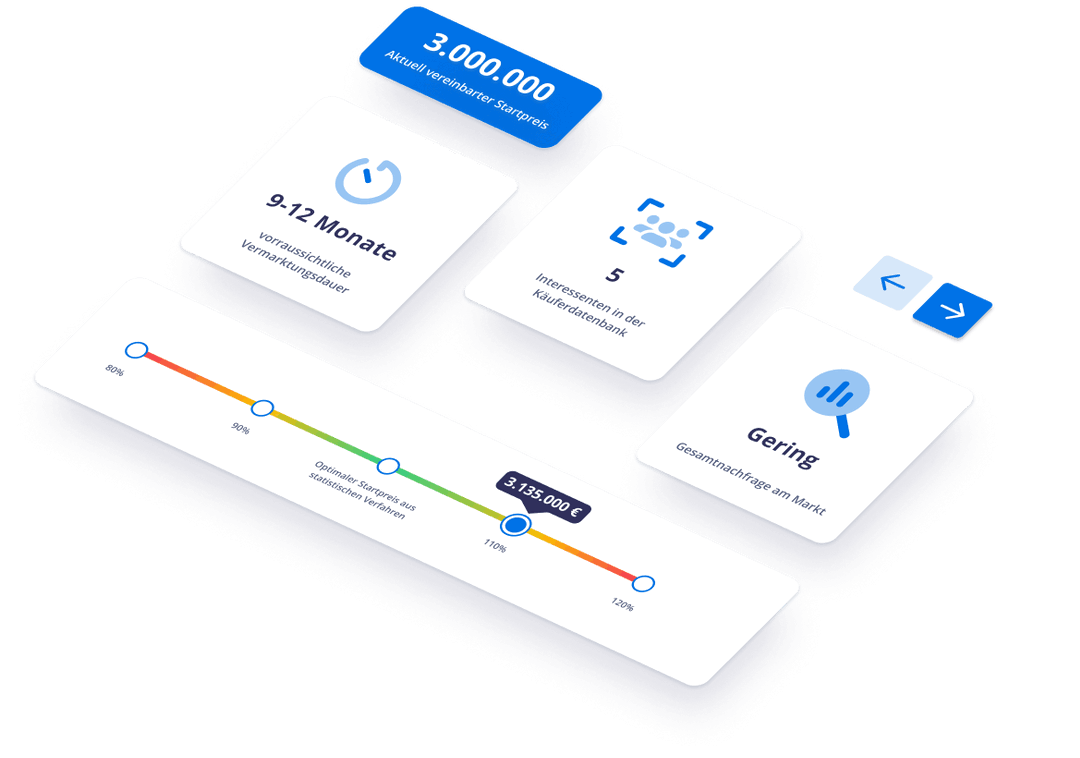 Nutzen Sie den Preisstrategie-Rechner im Kundentermin, um die voraussichtliche Vermarktungsdauer und die Anzahl der Interessenten in Abhängigkeit vom Preis anzuzeigen. Eine optimale Vermarktu ang wird so durch intelligente Anzeigenschaltung zum Kinderspiel.